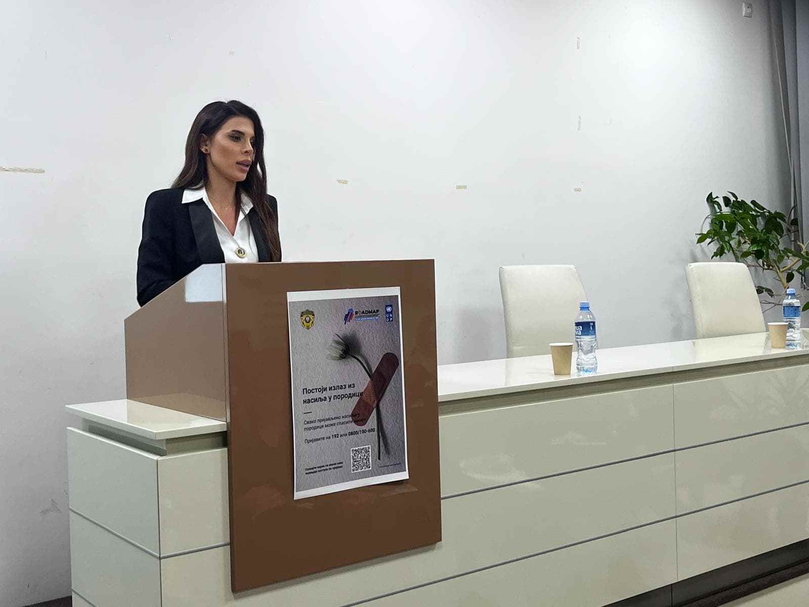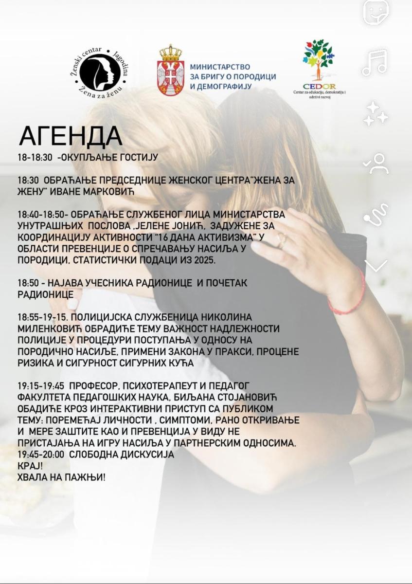 Učesnicima se zatim obratila Jelena Jonić, službeno lice Ministarstva unutrašnjih poslova, zadužena za koordinaciju aktivnosti „16 dana aktivizma“ u oblasti prevencije i sprečavanja nasilja u porodici, koja je predstavila statističke podatke za 2025. godinu i govorila o institucionalnom odgovoru na nasilje.